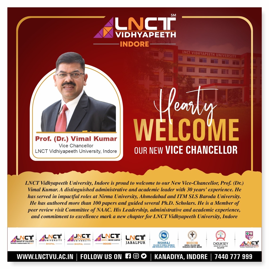 Meet Our New Vice Chancellor: Prof. (Dr.) Vimal Kumar LNCT Vidhyapeeth University, Indore is proud to welcome our New Vice-Chancellor, Prof. (Dr.) Vimal Kumar. A distinguished administrative and academic leader with 30 years experience. He has served in impactful roles …